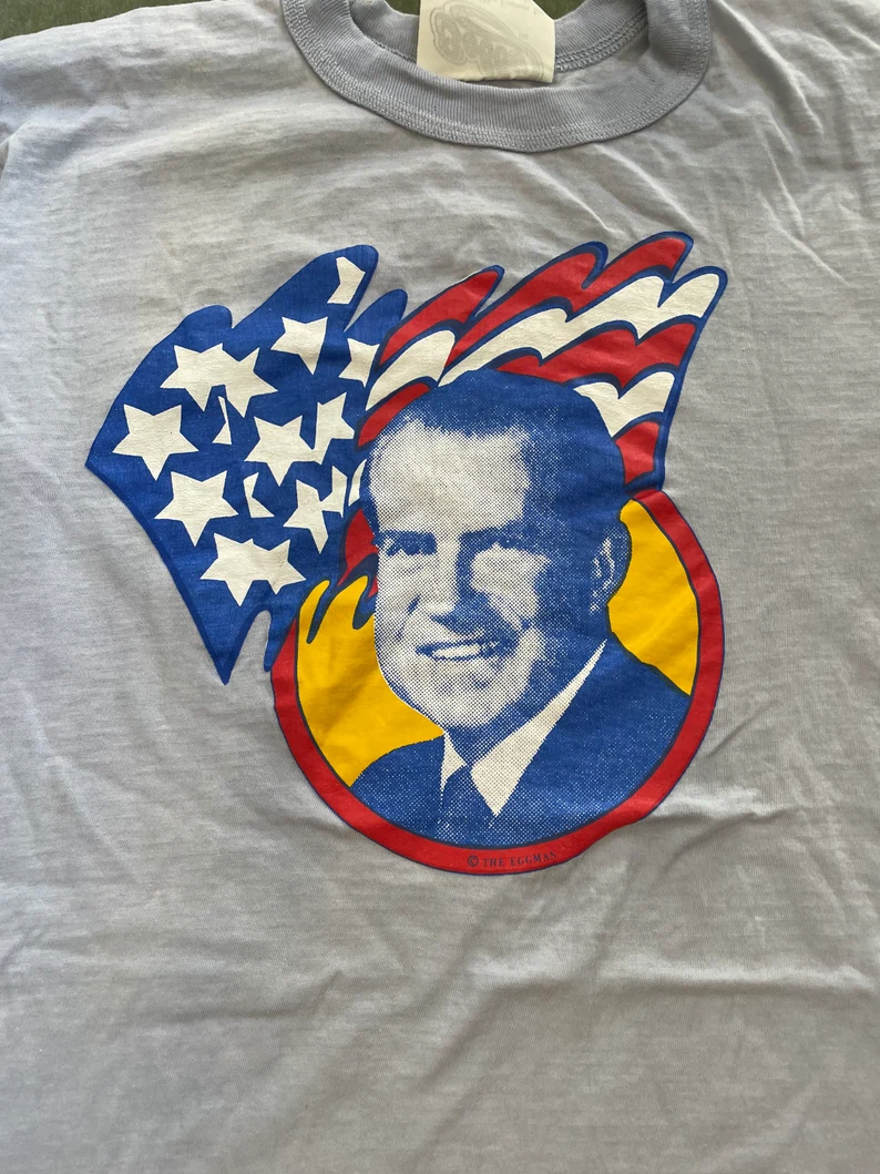 Not so controversial, but political is the campaign printed t-shirt for Nixon, 1972